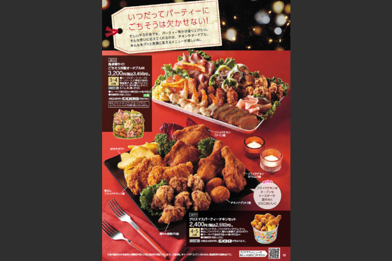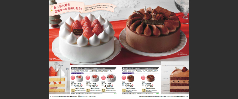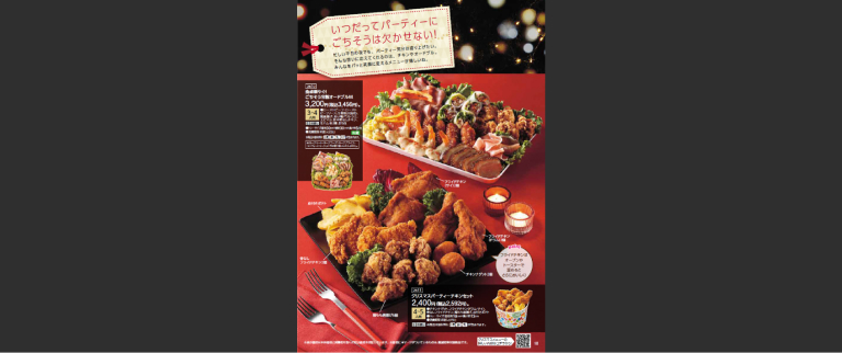 ケーキやチキン、オードブル等の豊富な商品ラインナップを取り揃えるクライアント様だからこその提案を行い、二極化に対しての紙面構成としては、商品ごとに合わせて価格の表示方法や表現を変更し、柔軟な対応を意識しました。